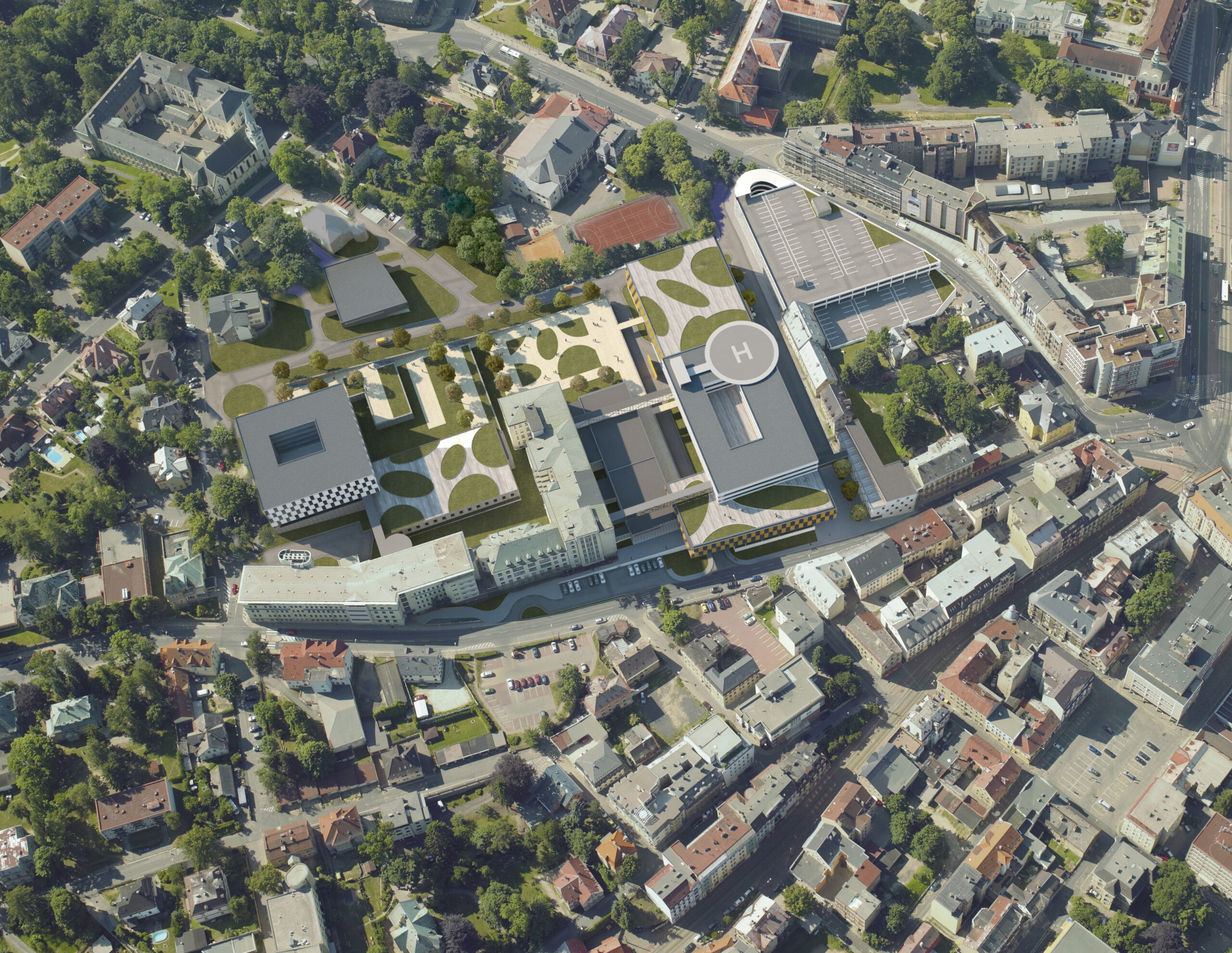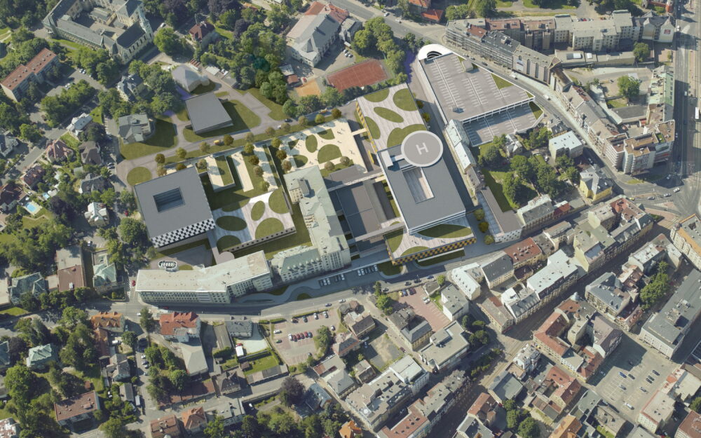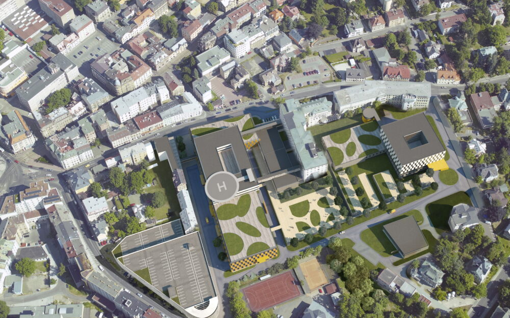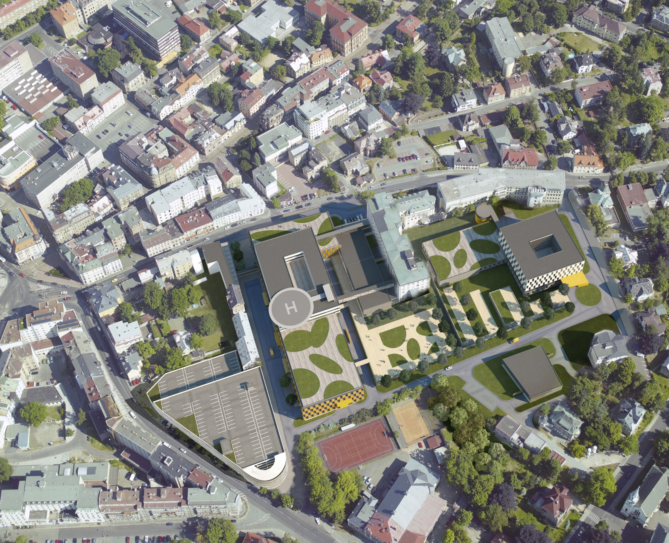 Cílem našeho soutěžního návrhu bylo dosáhnout kompaktního řešení jak pro lůžkové části, tak i pro vyšetřovací a léčebné složky nemocnice a jejich vzájemné propojení chodbami pro pěší, vnitřní dopravou a technickými rozvody.
