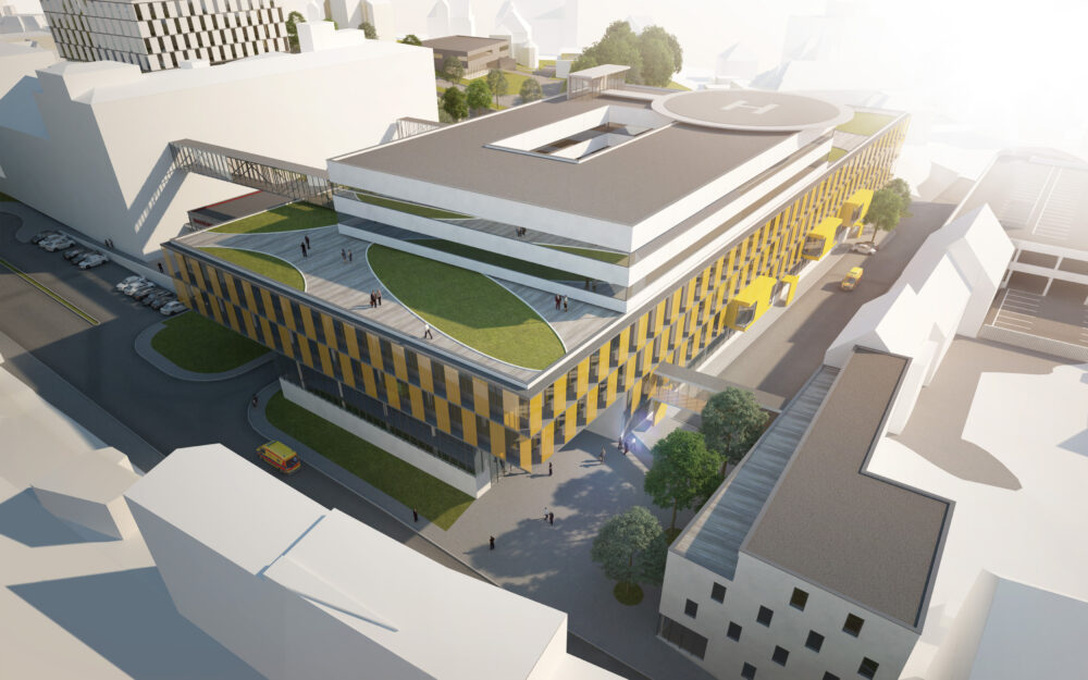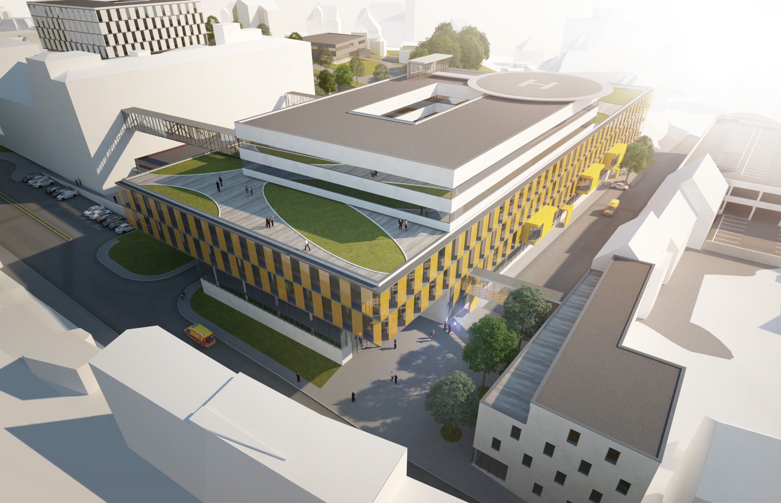 Navržený pavilon Centra urgentní medicíny (CUM) by dotvářel uliční frontu, prorůstal by do Husovy ulice pasáží, ve které jsou hlavní vstupy do Emergency a do budoucí haly nemocnice.
