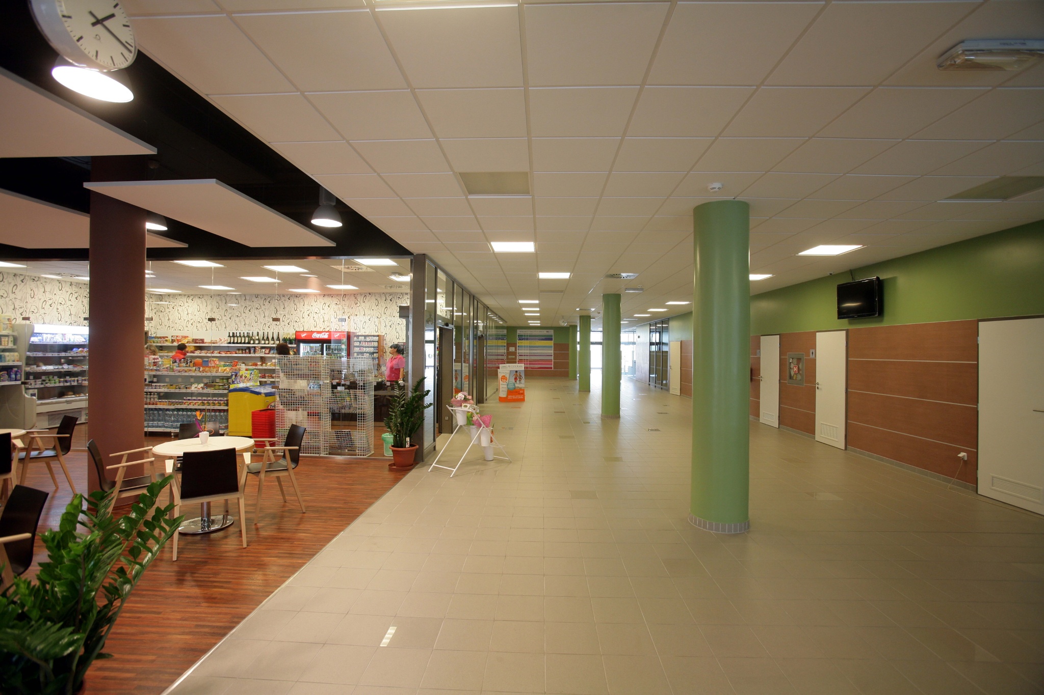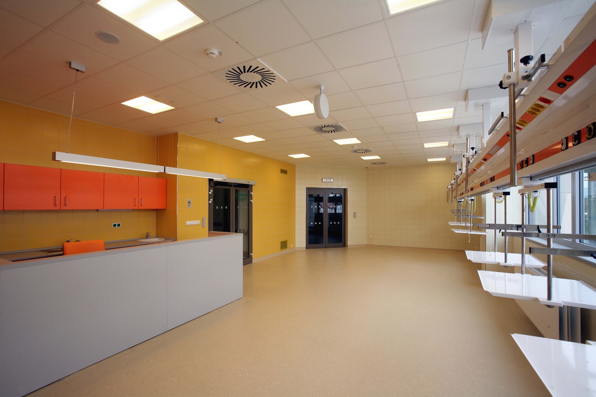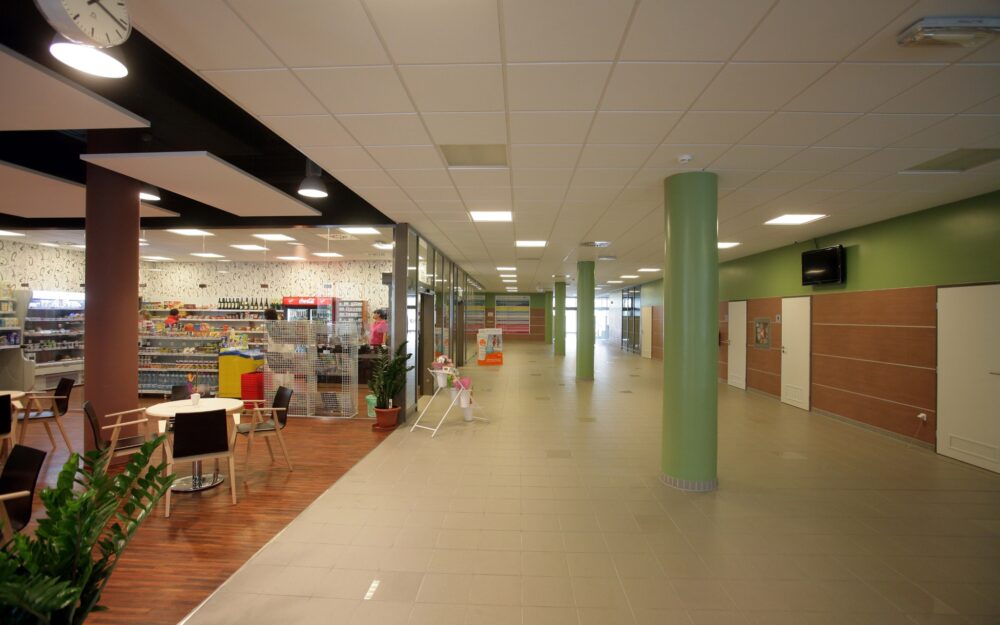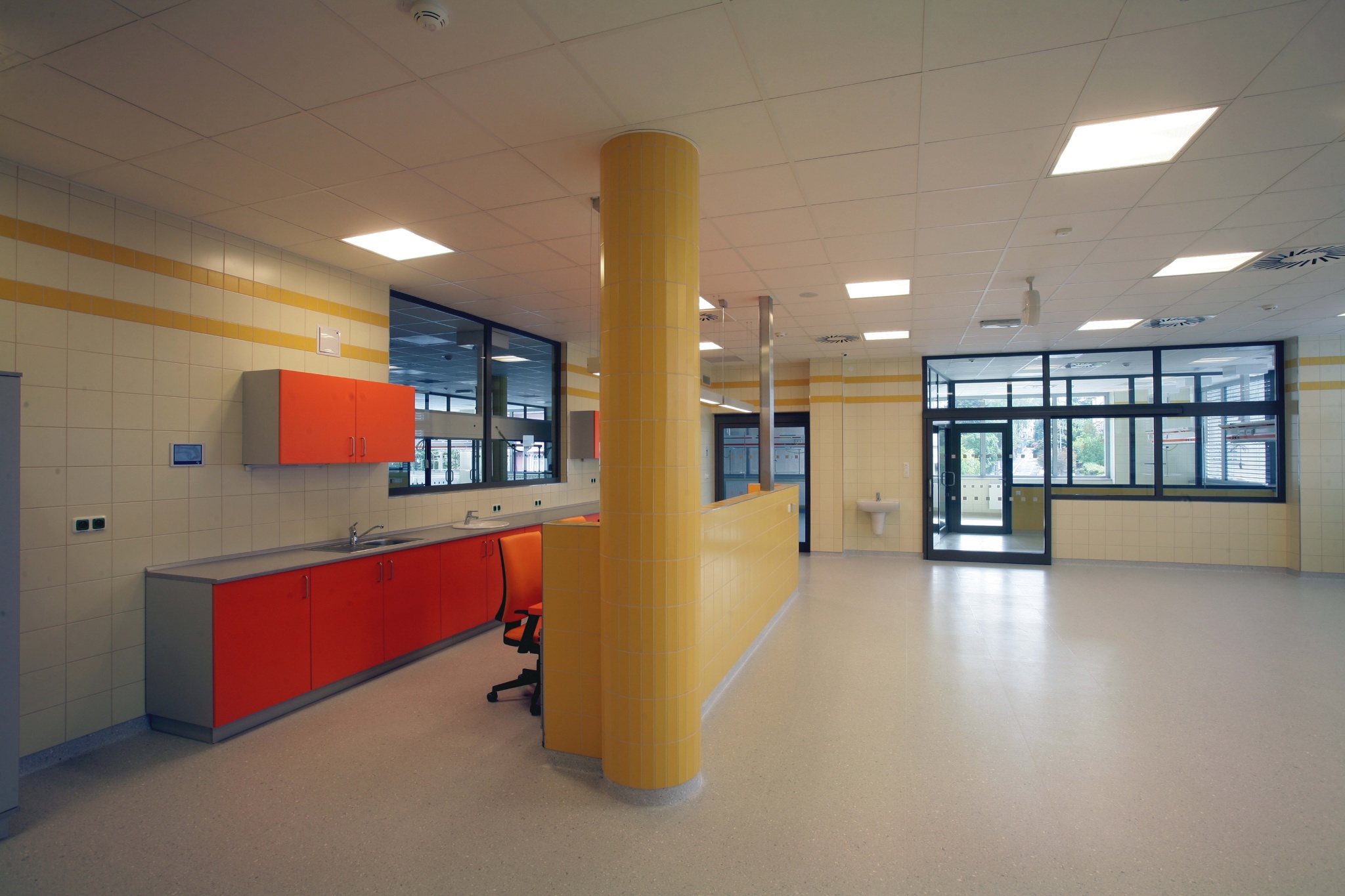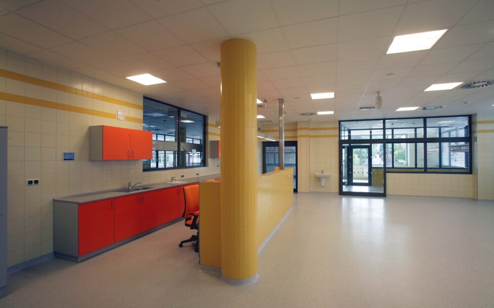 V 1.NP je vstupní část do celé nemocnice – recepce, hala, bufet, prodejní plocha, lékárna, interní urgentní příjem pacientů.