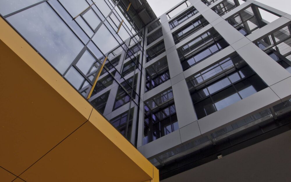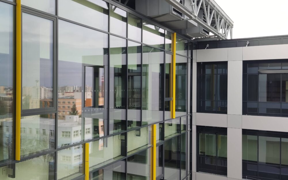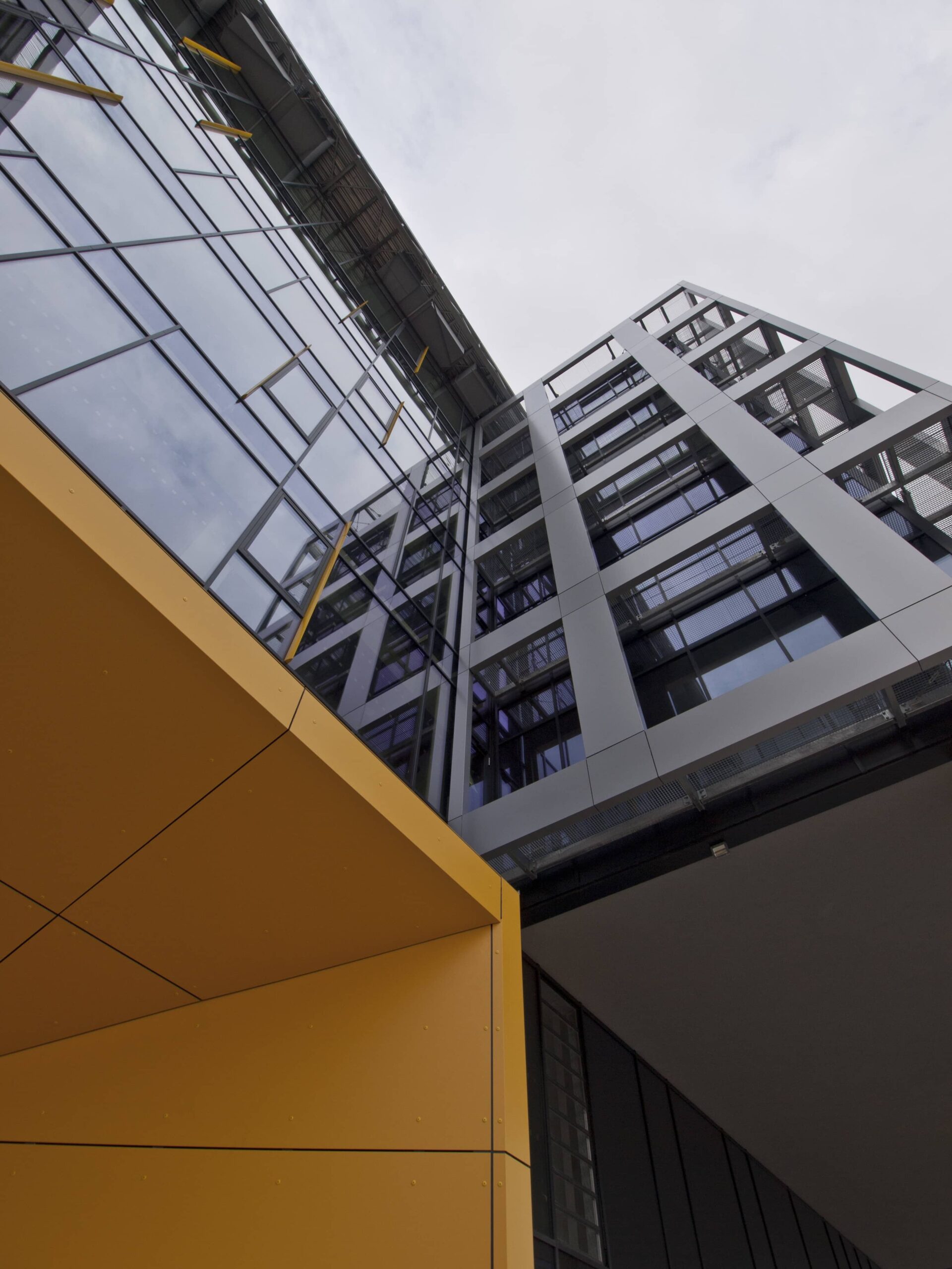Monoblok – hlavní hmota stavby je opticky rozdělena na 2 hlavní křídla, která vyrůstají ze společné podnože. Dvě podlaží tvoří zvýšené přízemí, 3. a 4.NP společnou podnož a následně 5. – 7.NP samostatná křídla.