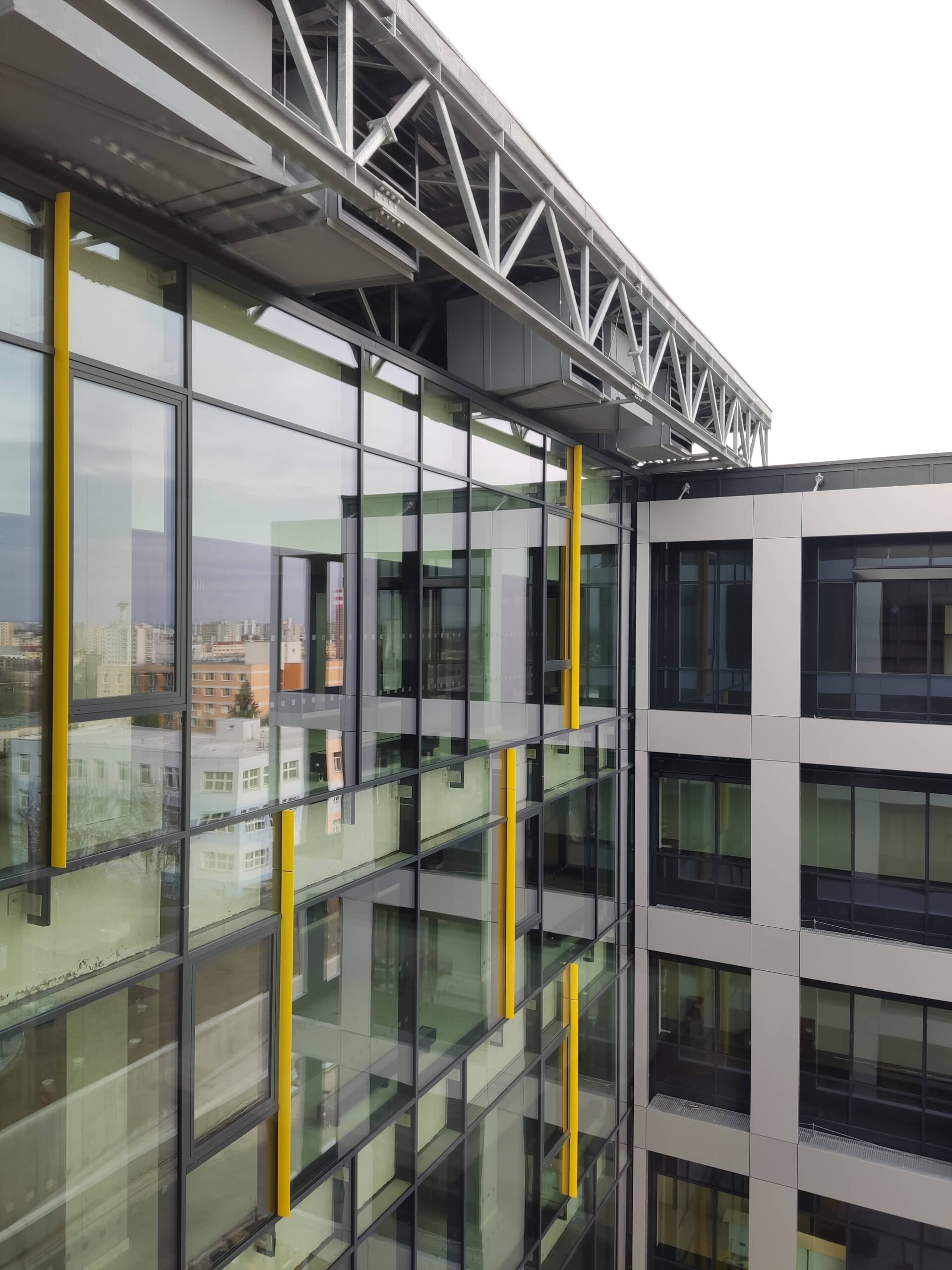 Mezi předsazenou fasádou a proskleným pláštěm objektu je technická chodba pro očistu  prosklených stěn. Před pláštěm je umístěna od 3. nadzemního podlaží lehká kapotáž zakrývající technickou lávku pro údržbu skleněné fasády, která bude prováděna z venkovního prostoru s využitím výše uvedené předsazené konstrukce.