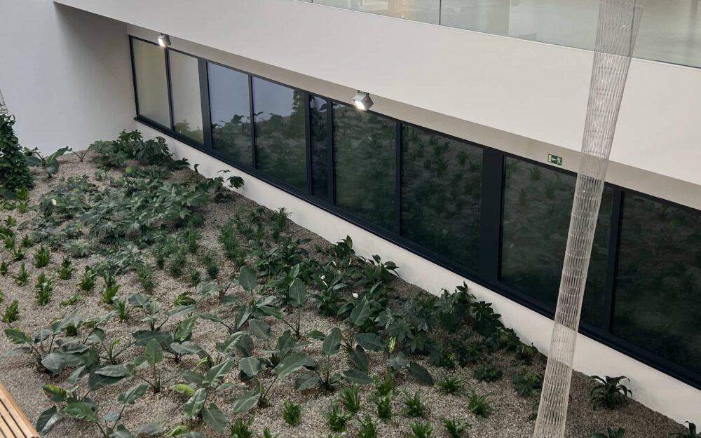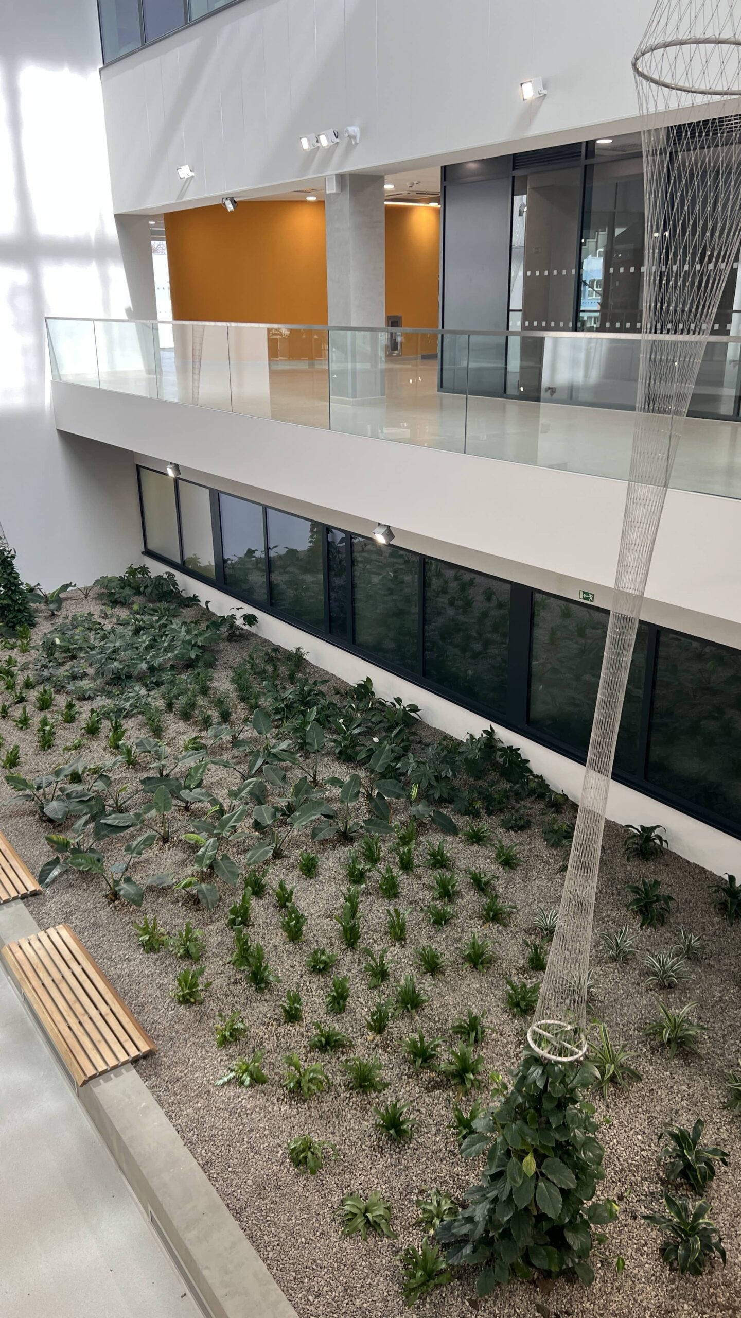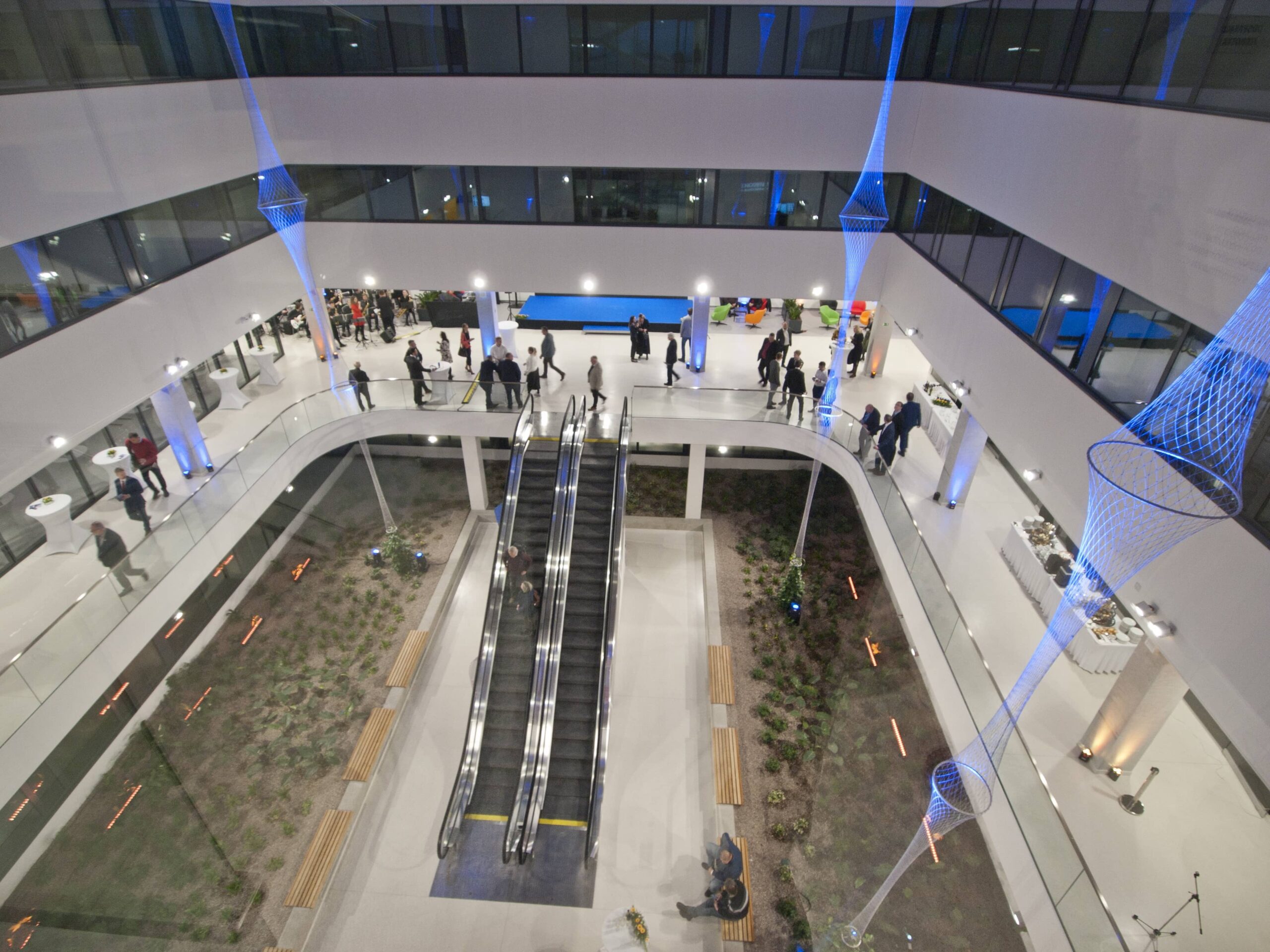 Vnitřní dispozici tvoří centrální atriový prostor prostupující všemi podlažími s nezbytnou kavárnou, bufetem, zónou pro návštěvy osázený bohatou zelení.