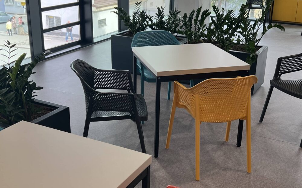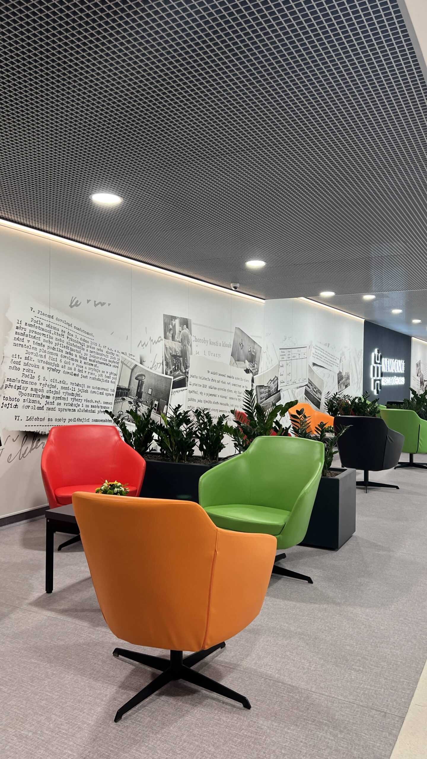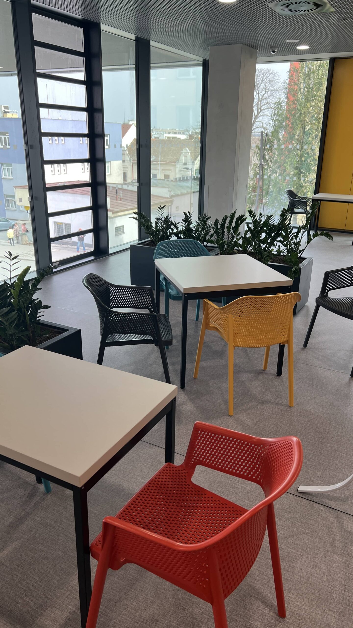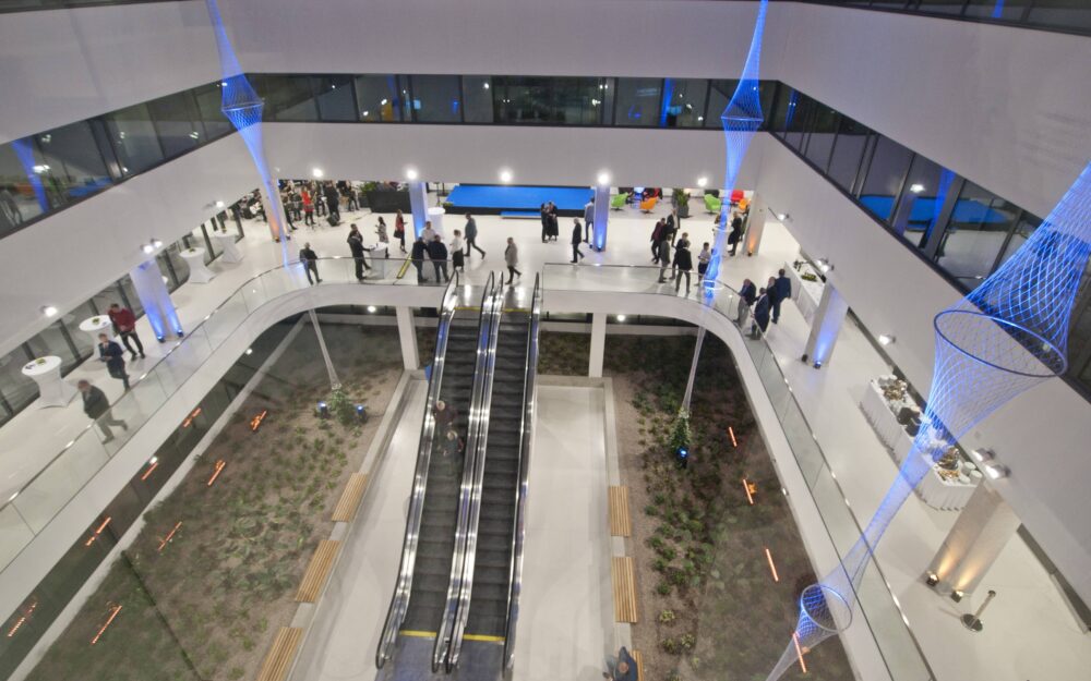 Vnitřní dispozici tvoří centrální atriový prostor prostupující všemi podlažími s nezbytnou kavárnou, bufetem, zónou pro návštěvy osázený bohatou zelení.