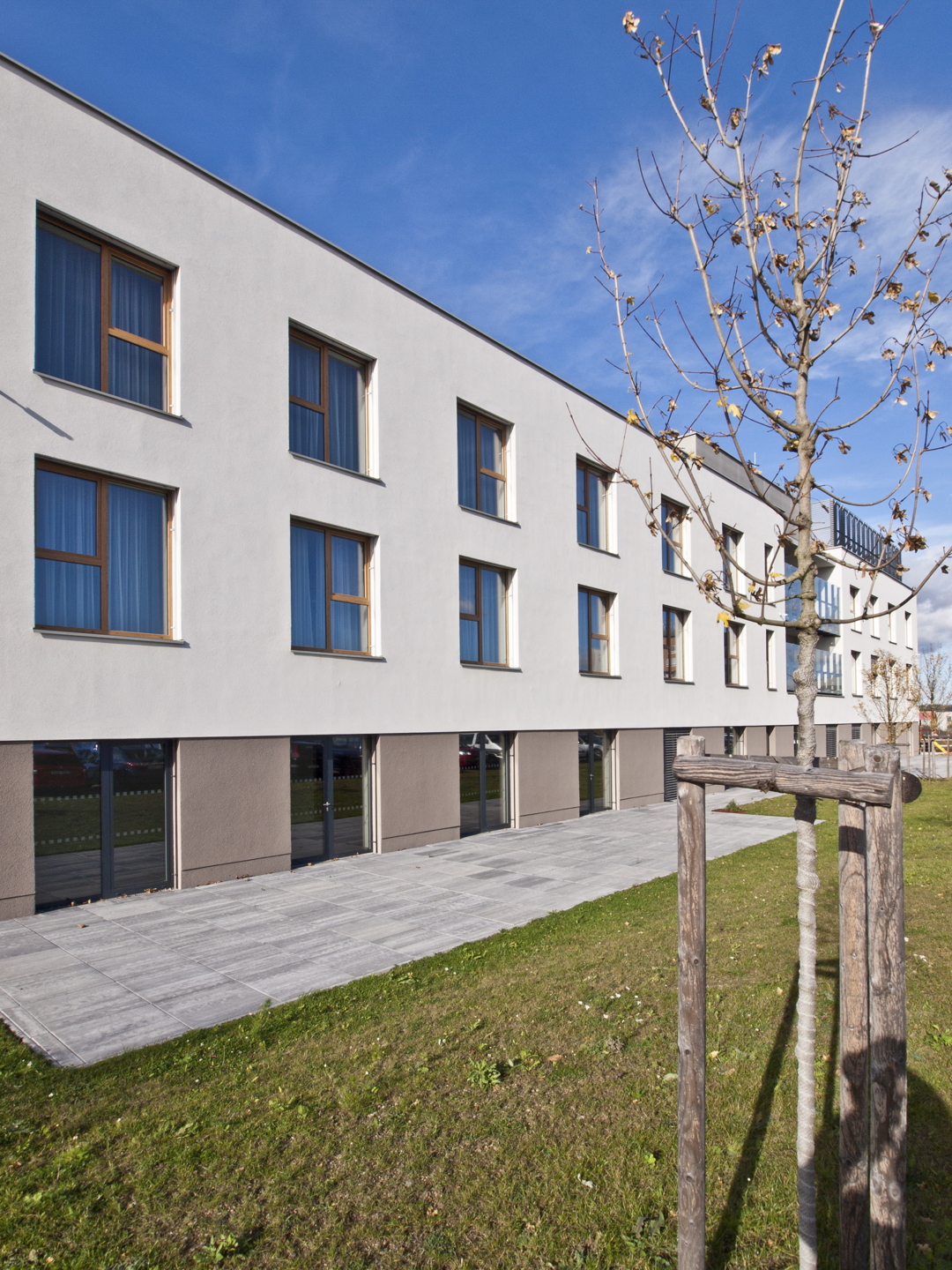 Zatímco „lůžkové“ části jsou s okny spíše bytové velikosti, které lépe odpovídají provozu, který se za nimi odehrává, fasáda „středové“ části je záměrně prolamována velkorysými prosklenými plochami, které mají za úkol, zejména ve směru plánované zahrady za objektem, zajistit maximální optické propojení interiéru s exteriérem.